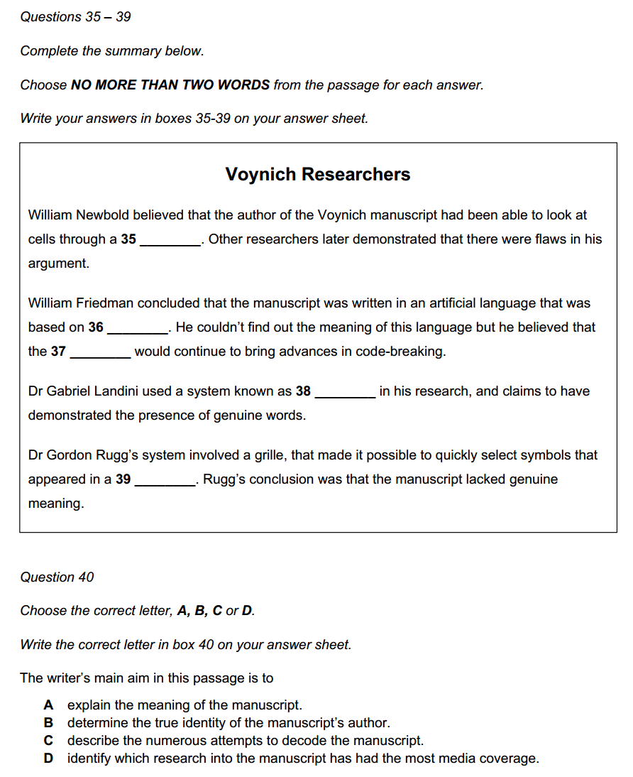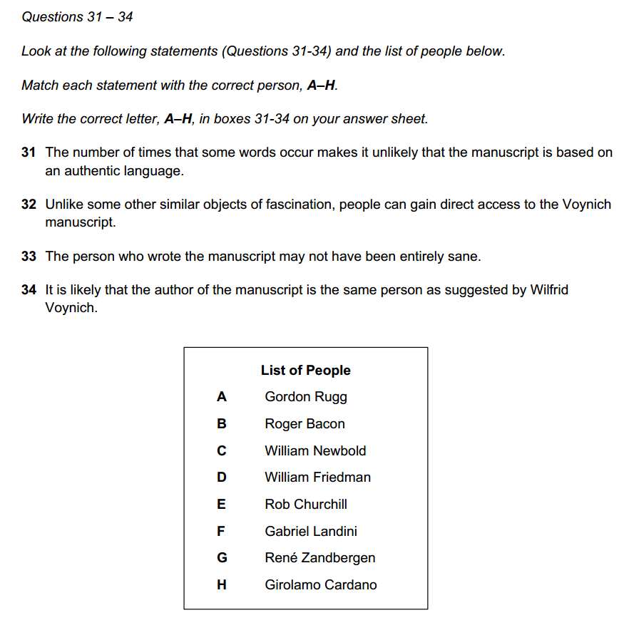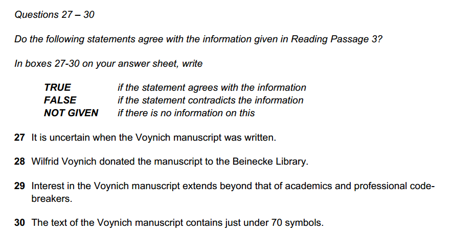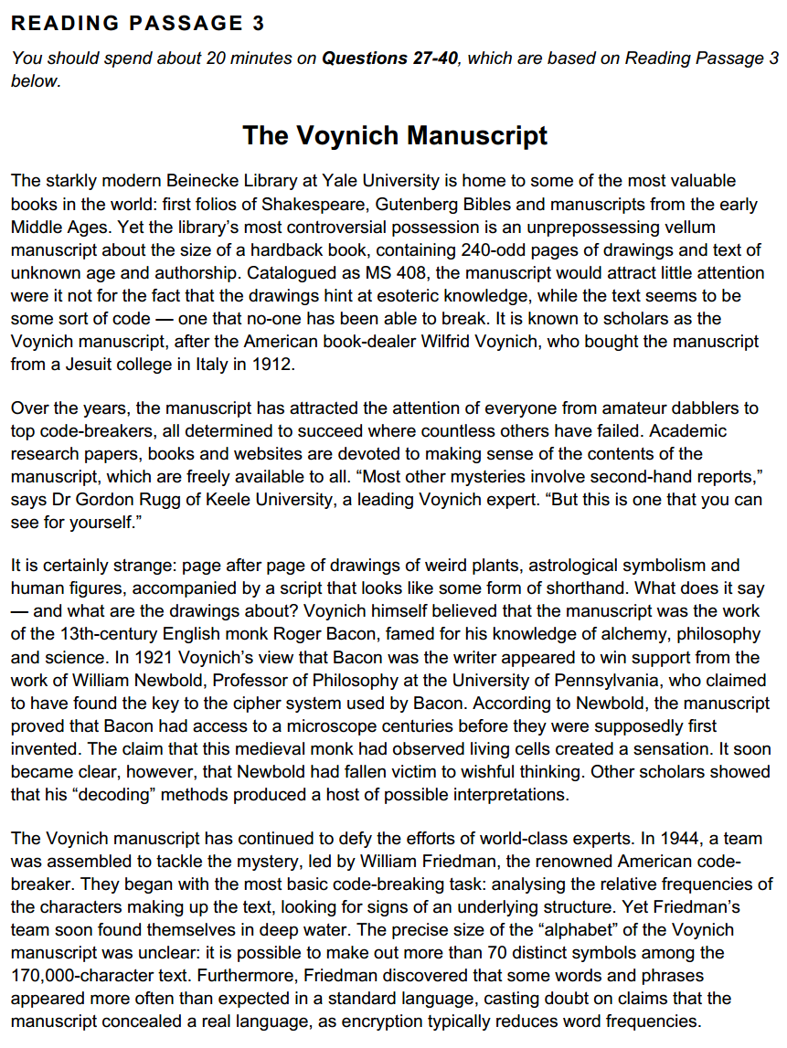 本篇文章,题型搭配可谓群英荟萃,四个类型竞相亮相,好在都是善良的题型,不必再受P3当中的单选困扰,常规作答即可;再看文章,也是咱们的老熟人了,2025年4月5日考过,不过题型搭配不完全相似。说到伏尼契手稿(Voynich Manuscript),这是一本15世纪初、用未知文字书写、配有大量奇异插图的神秘羊皮书,至今无法破译,被称为“世界最神秘的书”。书中包括草药篇、天文学篇、生物学篇、宇宙篇、制药篇、杂记篇共6个部分的文字信息及插图。既然目前没有破译出来,那么这类文章更多地是描述其发现经过、研究历程,这种写作的逻辑在剑17Test2Passage1 The Dead Sea Scrolls中亦有体现,因此在日常答题练习当中,除了弄清楚每道题外,还可以站在写作角度上梳理一下文章的行文逻辑,也能帮助我们更好地理文本,在处理诸如Heading类这种题目时更为得心应手。