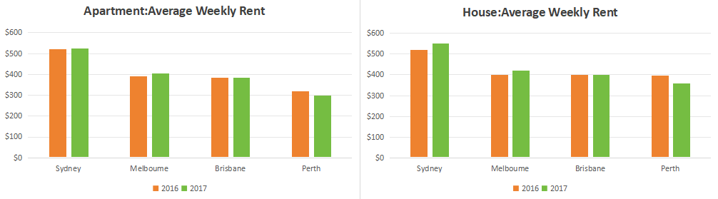 The chart below shows average weekly rent for apartment and houses in four Australia cities in 2016 and 2017.