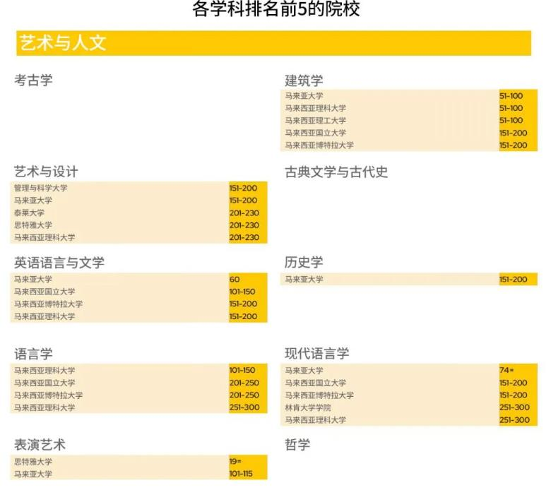 在艺术与人文领域中,马来西亚高校共有3个学科上榜世界前50名,另有5个学科跻身世界前100名。