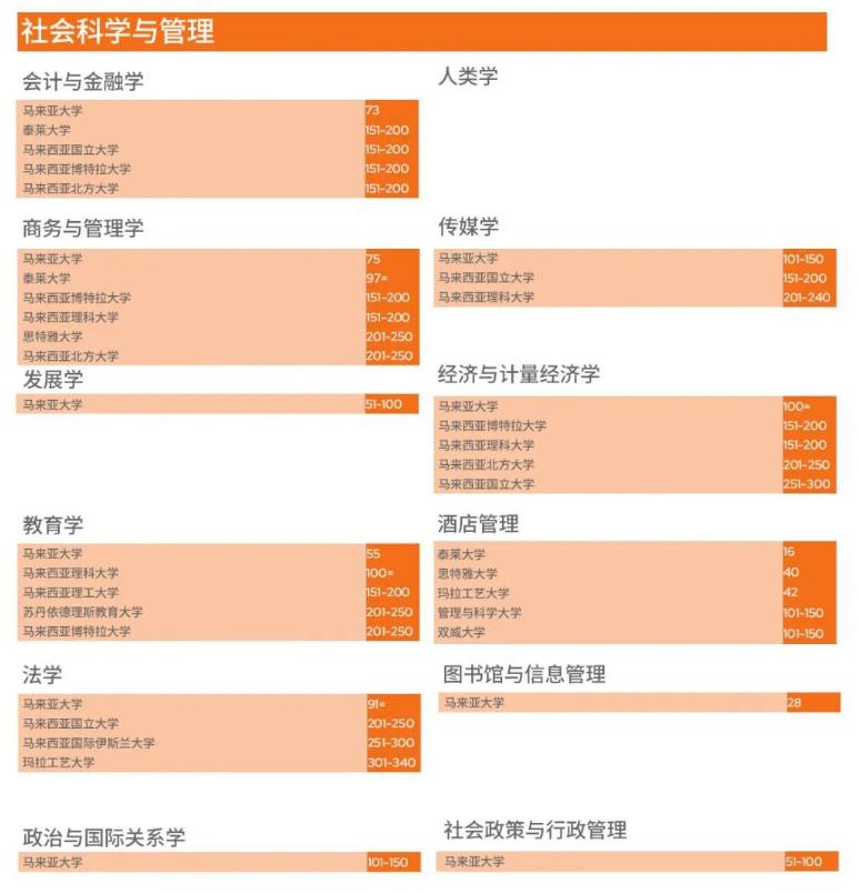 在社会科学与管理领域中,马来西亚高校共有4个学科上榜世界前50名,另有9个学科跻身世界前100名。