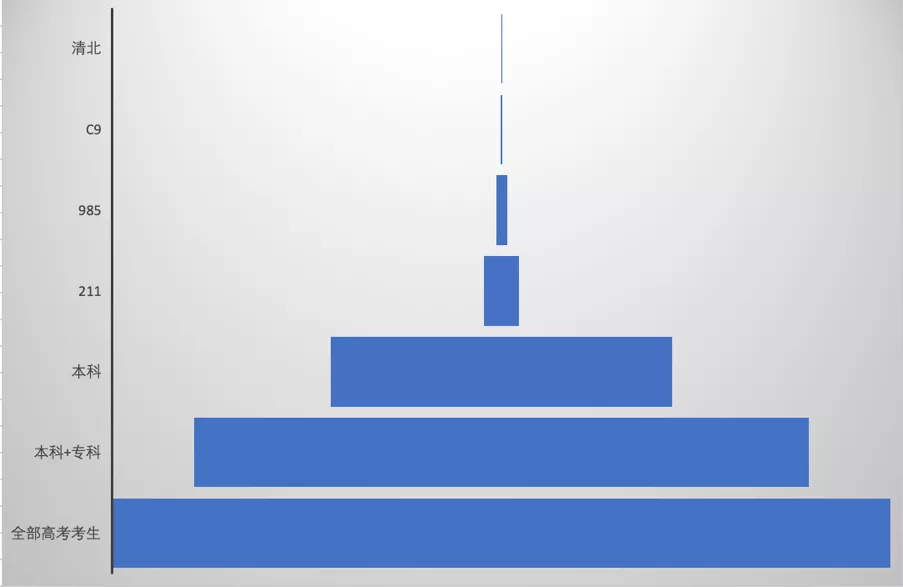 现在,上大学已不是难事,参加高考学生中,超过90%都能上各种形式的本专科大学,上本科也有40%的比例,但是上好学校、好专业,不管是211、985、双0、C9、北大清华等,那就难了。(如下图)