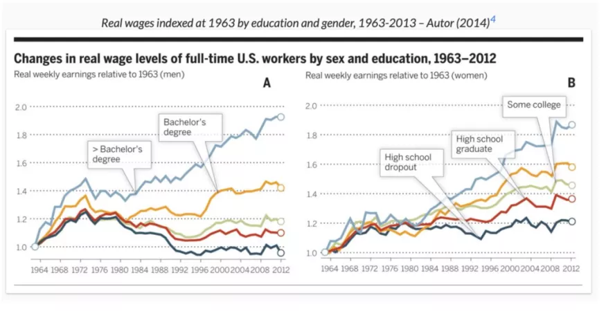 比如看上图,麻省理工学院戴维·奥特尔教授2014年在美国《科学》杂志上发表的一篇研究显示,在美国1963年到2013年的50年中,不管是男性还是女性,刨掉通胀因素,受过大学和大学以上教育的实际收入增长是最明显的。