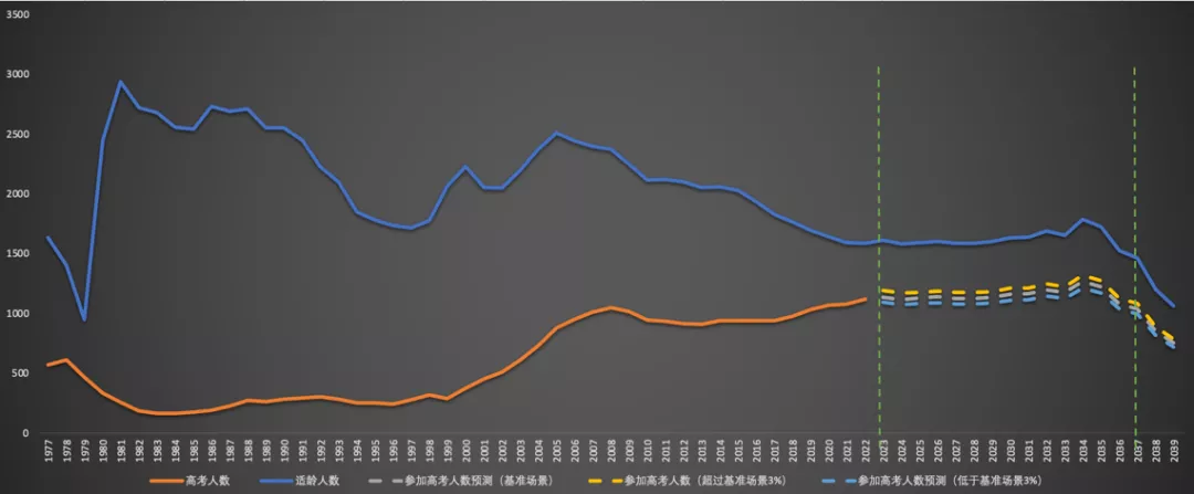 (见上图)这三条虚线就是按照三种场景(上下波动3%)来进行的一个高考人数的0(Scenario Analysis):