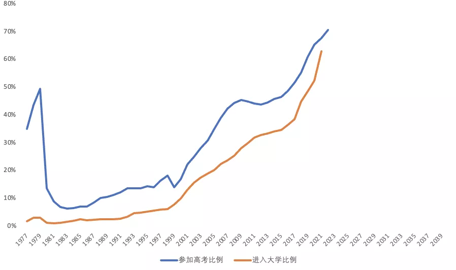 好,那么继续看下图:橙色线代表历年参加高考的人数,蓝色线代表每年的适龄人口(暂时没有考虑复读、统计口径等其他因素,因为每年都这些因素影响,这里仅做粗略推算)。可以看出,橙色线和蓝线的距离在接近,也就是说,想参加高考的比例在增加。