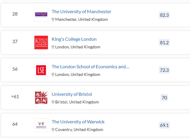 就本次榜单上的英国大学表现而言,在QS排名的90所英国大学当中,有28所大学的排名相比去年有所升高,22所大学排名保持稳定。