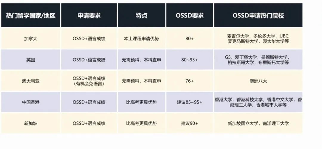 像加拿大、英国、澳大利亚、中国香港、新加坡等院校的申请要求大部分都需要OSSD+语言成绩去申请。但是也有部分院校接受学生在不提交语言成绩的情况下使用OSSD成绩去申请。但不论哪种方式,OSSD成绩越高,申请院校时优势也就越明显。